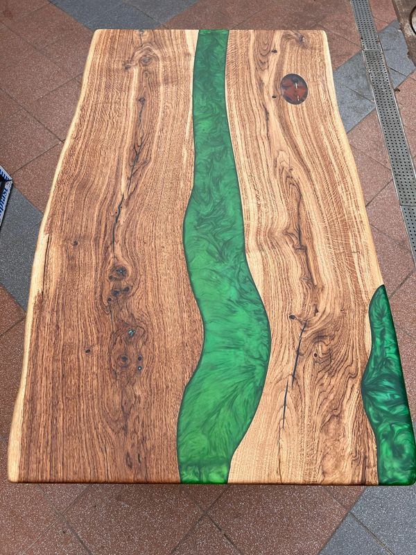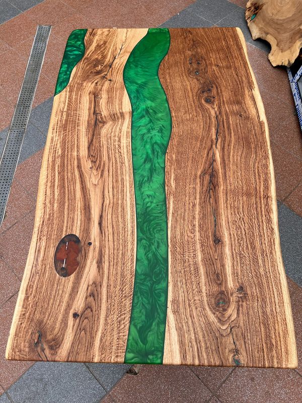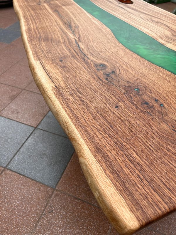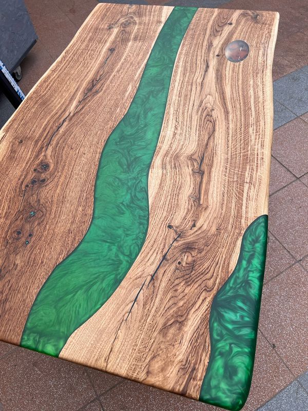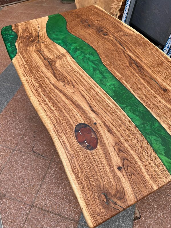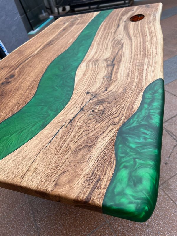 Această masă spectaculoasă, cu dimensiunile de 1300 × 750 mm, îmbină frumusețea naturală a stejarului roșu cu fluiditatea rășinii verzi, creând un efect de râu ce curge printre fibrele calde ale lemnului.