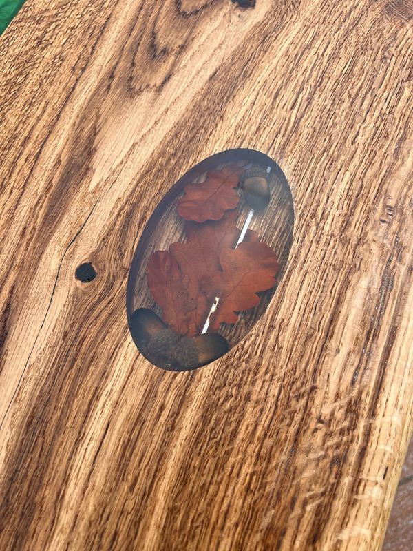 Un detaliu aparte este inserția de rășină transparentă, unde o frunză de stejar și câteva ghinde au fost încastrate, simbolizând legătura dintre arbore și rodul său. Această integrare naturală transformă masa într-o adevărată piesă de poveste, cu un design ce evocă forța și noblețea stejarului.