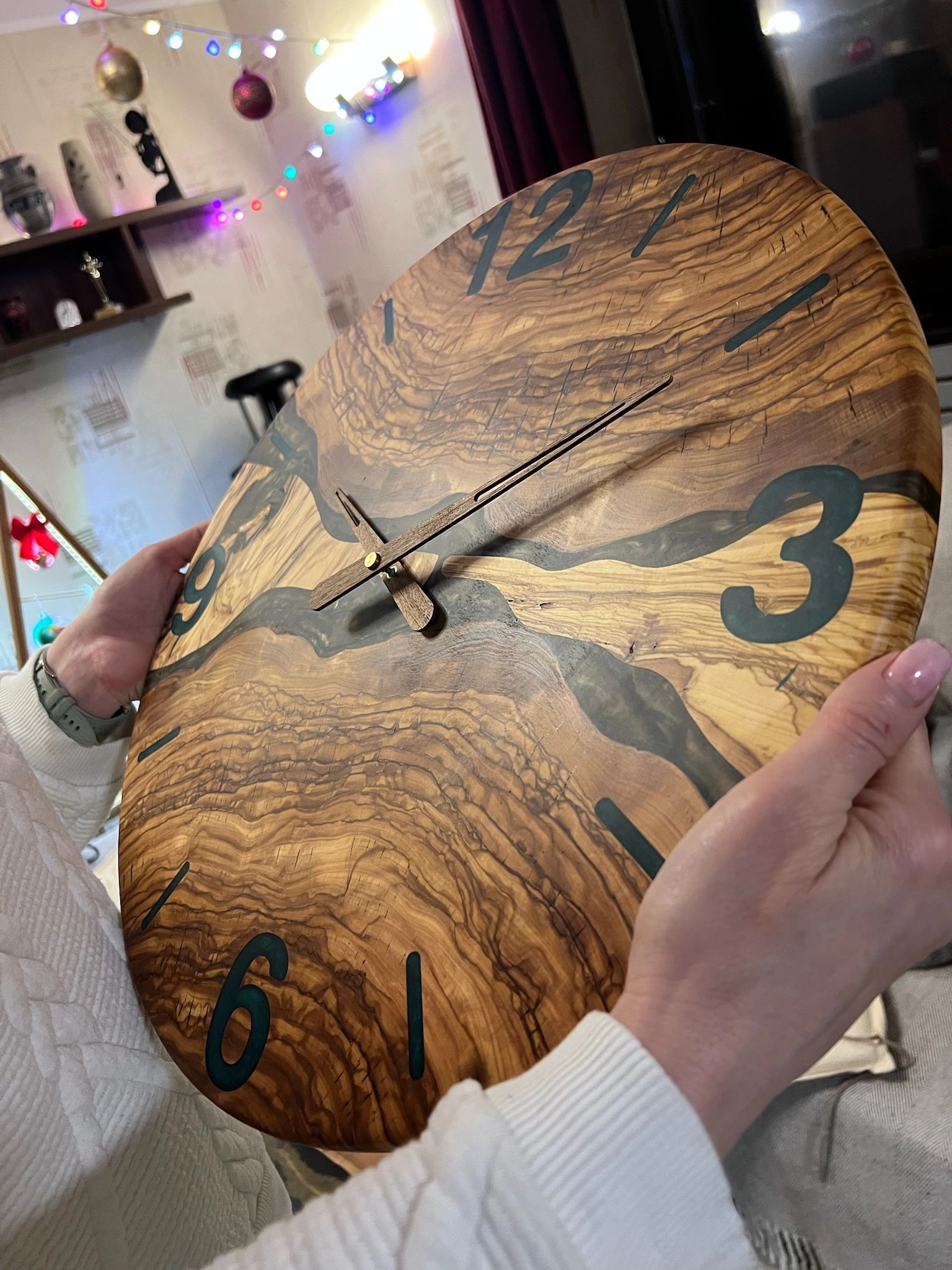Ceas de perete din lemn de măslin și rășină epoxidică, diametru 60 cm. Realizat manual, cu limbile tot din lemn, un decor elegant și unicat. Cu dimensiunea de 60 cm, acest ceas devine o piesă centrală de decor, potrivită pentru living, birou sau orice spațiu unde eleganța și originalitatea sunt apreciate.