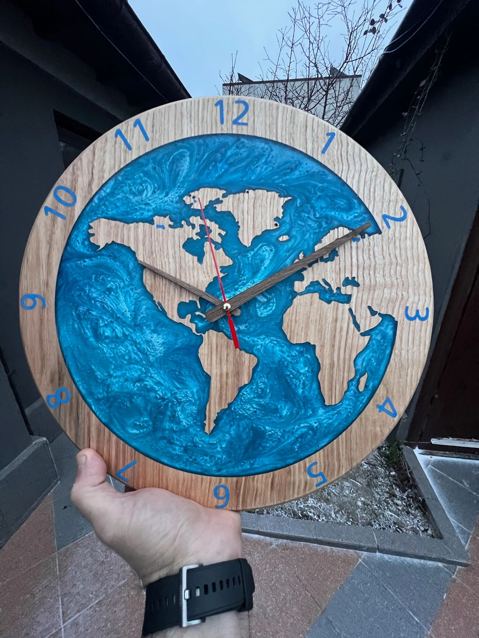 Ceas de perete realizat manual din lemn de frasin și rășină epoxidică albastră, cu design mapamond. O piesă de decor care aduce stil, culoare și originalitate în orice încăpere.